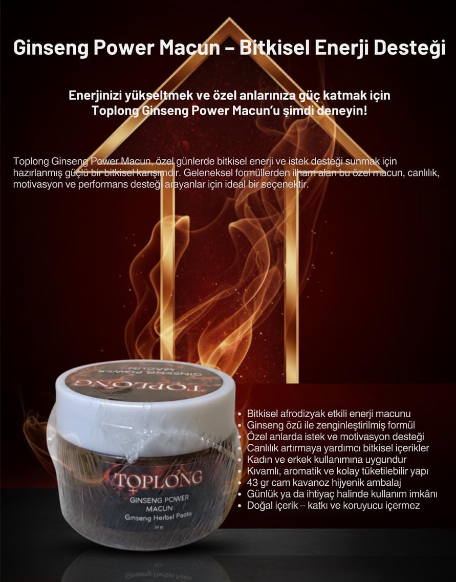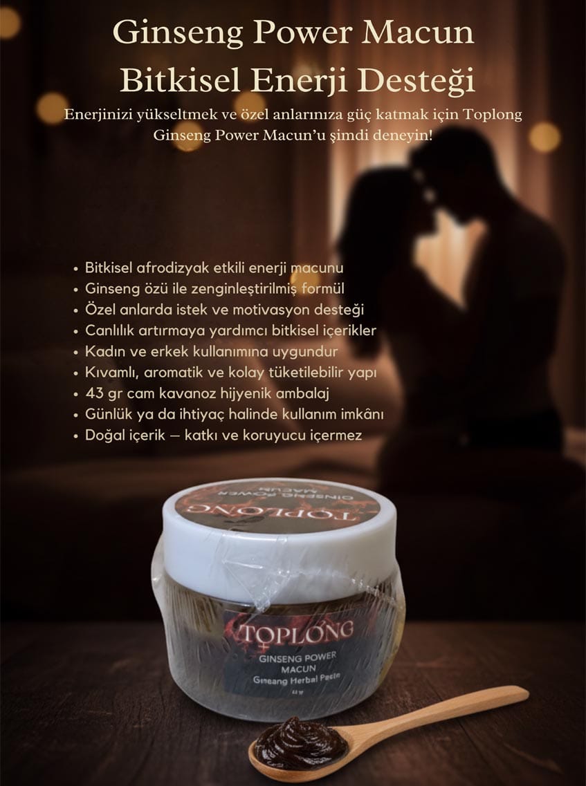 Toplong Ginseng Power Macun, tamamen bitkisel içeriklere sahip olup herhangi bir tıbbi tedavinin yerine geçmez; yalnızca özel anlarda destek arayan yetişkin bireyler için yardımcı bir ürün olarak tasarlanmıştır.